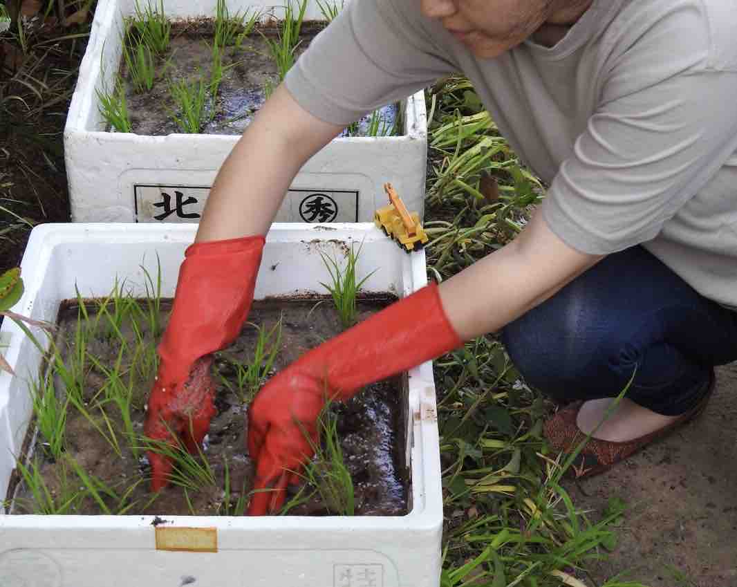発泡スチロールに、野菜や赤米を植え