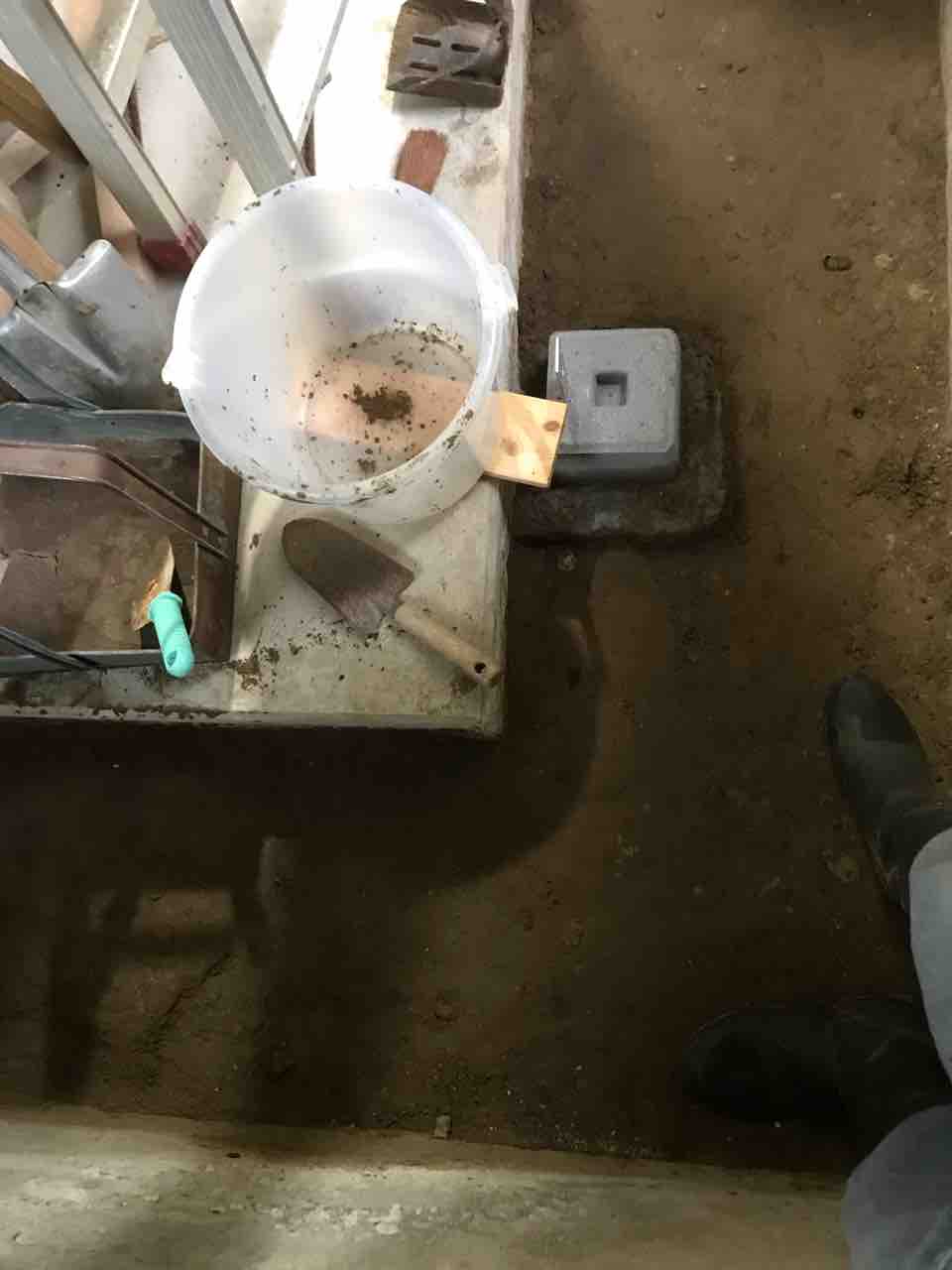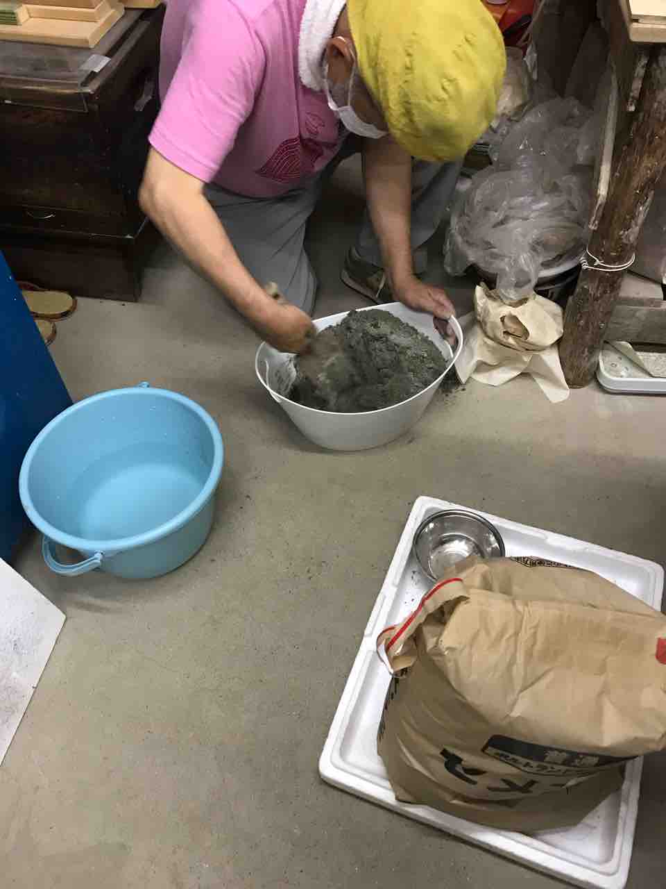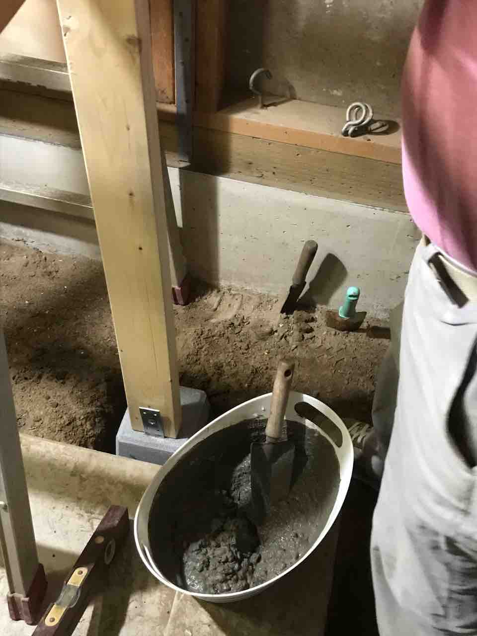 土台用のセメントをこねて